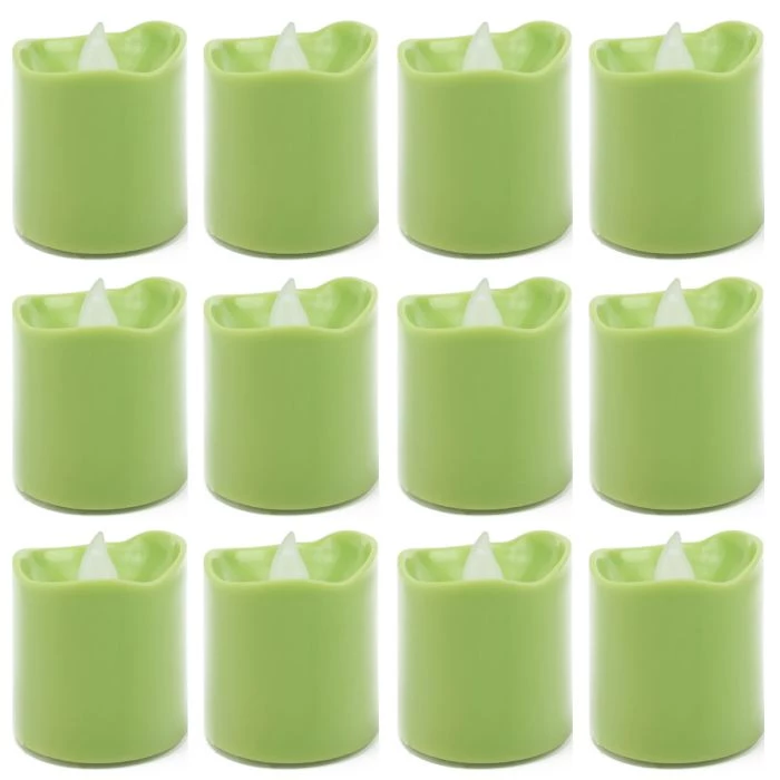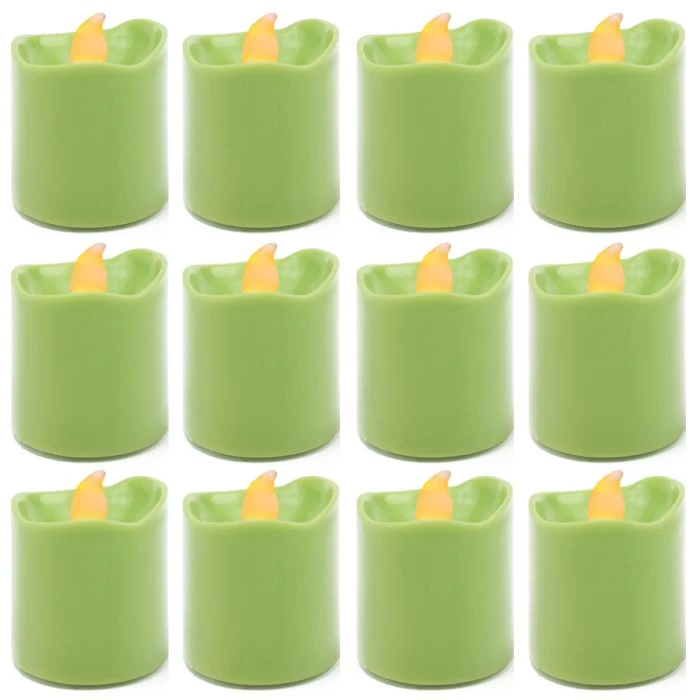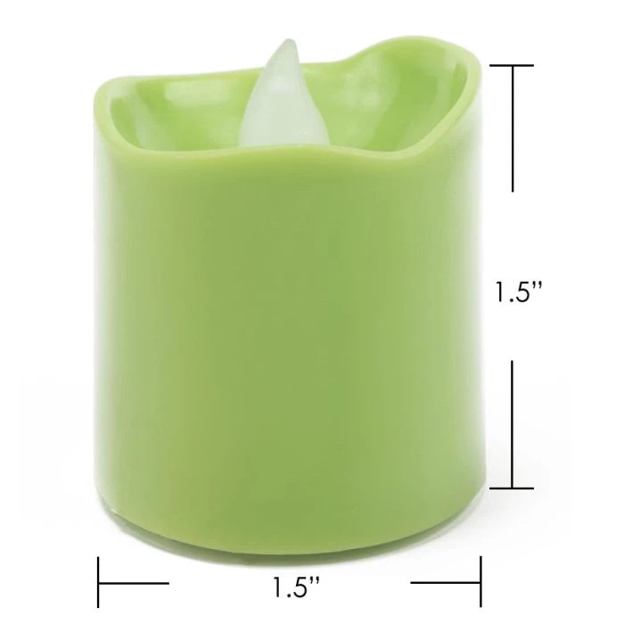 Dimension: H-1.5″, Body Width-1.5″ (Votive Style) Packing: Pack of 72 pcs & 144 pcs | Color: Green Casing with Amber Flame USE: These LED votive candles are great accessories to create the elegant and romantic ambiance for any weddings, parties, events and home decoration purpose. The LED candles are widely use in restaurants and event ballrooms. SPECS: Flickering tea light candles are operated with CR2032 battery, which make the candles last for over 100 hours with non-stop use. HOLIDAYS MUST HAVE: Flameless candles makes great and affordable party favors and gifts for birthdays and holidays like Halloween, Thanksgiving and Christmas.