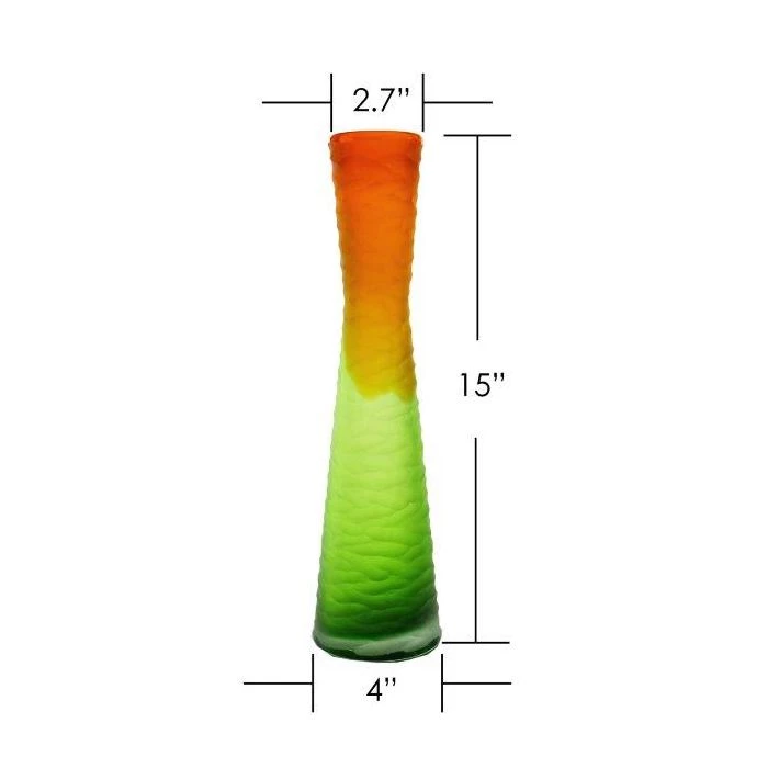 Dimension: H-15″, Open-D-2.7″ | Color: Green & Orange Mixed Packing: Pack of 2 pcs and 6 pcs DESIGN: The two tones color create a stunning layered presentation in this tier vase. This creation combines glass blowing techniques with contemporary design to form precious decorative piece. DETAILS: Its thick and heavy mouth-blown glass design with beautiful “Edge Carved” gives it a rich look and feel that adds glamorous style to any room. PERFECT GIFT: A perfect gift as Housewarming, Mother’s Day, Wedding Present, Holiday and Corporate Gifts.