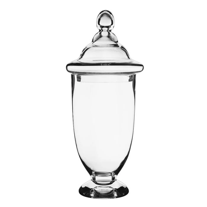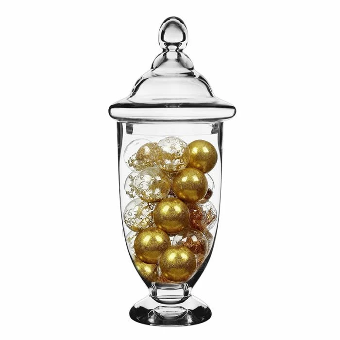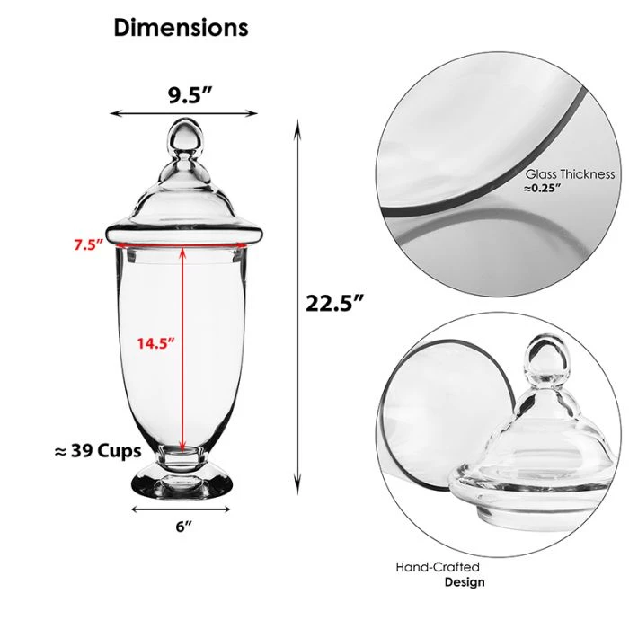 The perfect candy jar for gala events or grand wedding receptions. Make a bold statement in your foyer entry with this grand-size glass jar. Fill this jumbo jar with your favorite fruits of the season or your impromptu posies to showcase your unique style to your guests. Arrange a harmonious apothecary collection and generate warmth to your home décor by adding dried pumpkins, pine cones, maples leaves and dried corns to effortlessly transform your space into a welcoming gathering place this fall. Juxtapose it with two different styles to create a dynamic display perfect for the entry console.