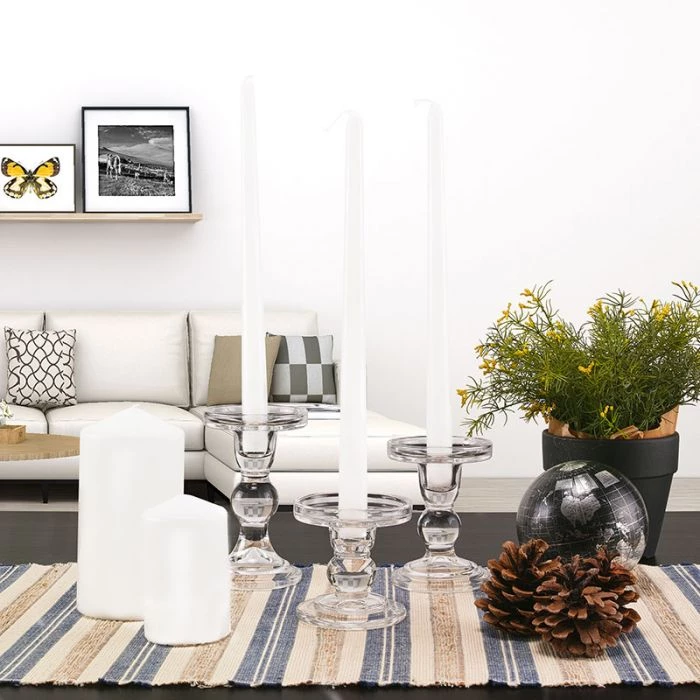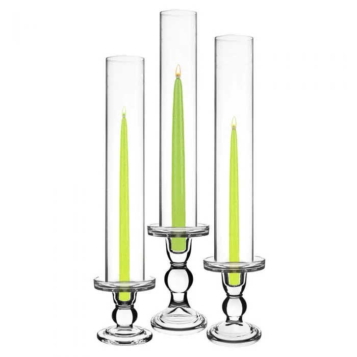 This series of taper/pillar candle holders are our staffs’ favorite pick. The stem featuring a single round bubble, decorate with brilliant simplicity is what the designers and brides cannot resist. This clear glass pillar candle holder is perfect for displaying your pillar candle (D-3″ or smaller) and it’s ideal for both wick and LED candles. Dual-purpose candle holders can be used for pillar or taper candles. You will find a slight lip and an indented center for potential wax spillage. This piece is great for weddings, restaurants, and churches use.