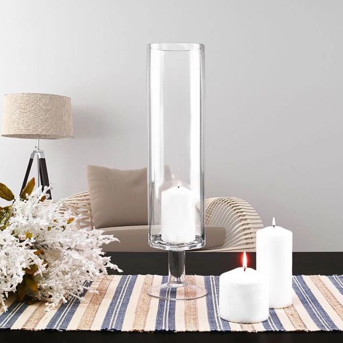 This series of contemporary clear glass candle holders is tall and slender in design. The design has a straight circular cylinder silhouette with a proportioned footing. The clear glass design allows any candle color to gleam in its surroundings. Whether you are planning a wedding, a holiday party, or an anniversary celebration, these darling candleholders will illuminate your event with class. A popular design for these elegant candleholders is to arrange an array of candles in varying heights for a dynamic layout. The candleholders are available in 3 sizes ranging from opening diameters of 4”, 5”, and 6”. The total height of the holder is identified by “/” after each product ID, e.g. The open flame from the candle would burn within the cylinder.