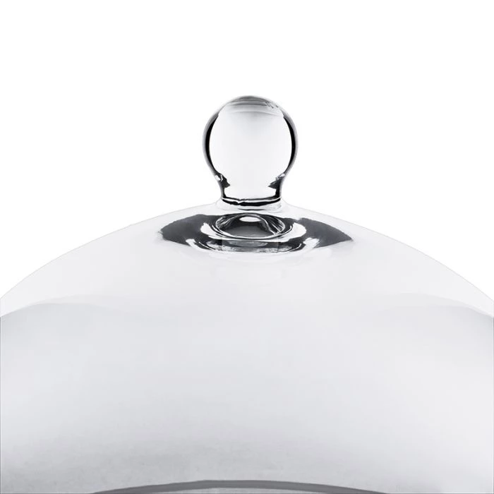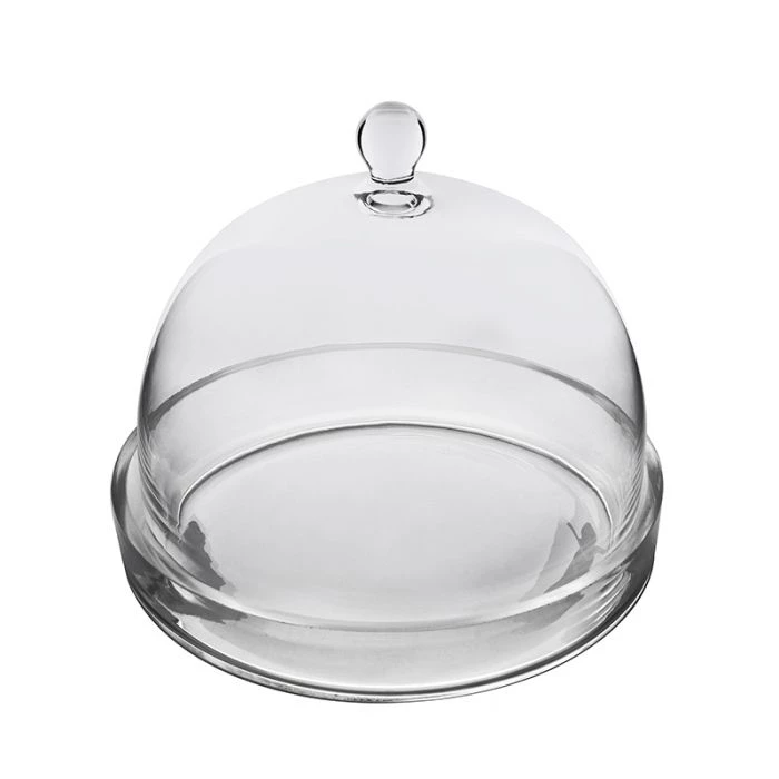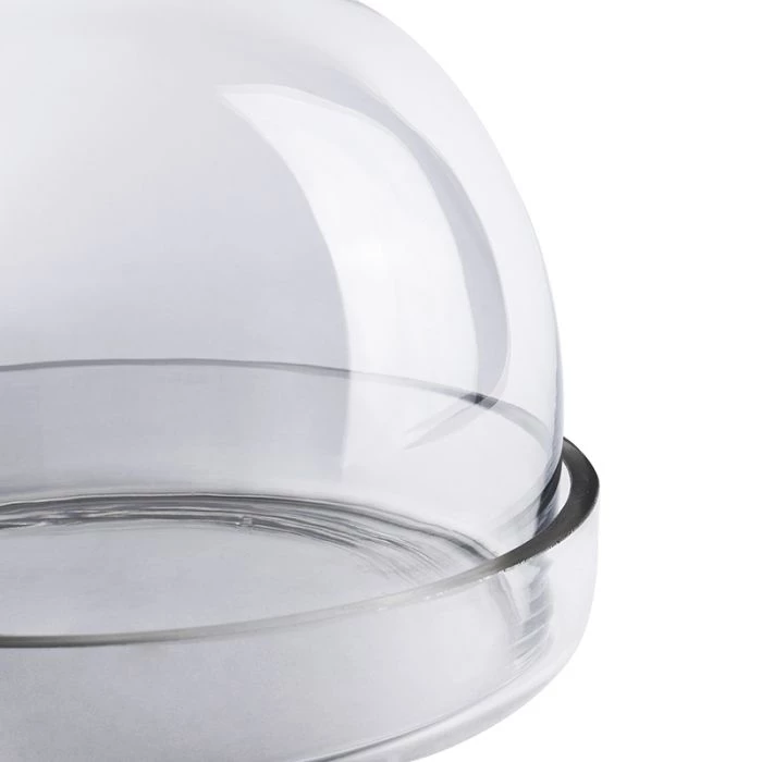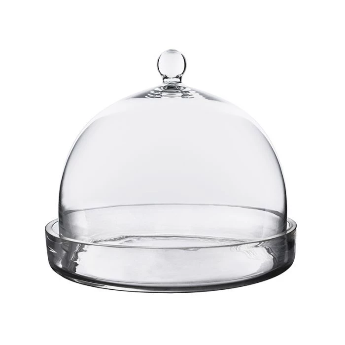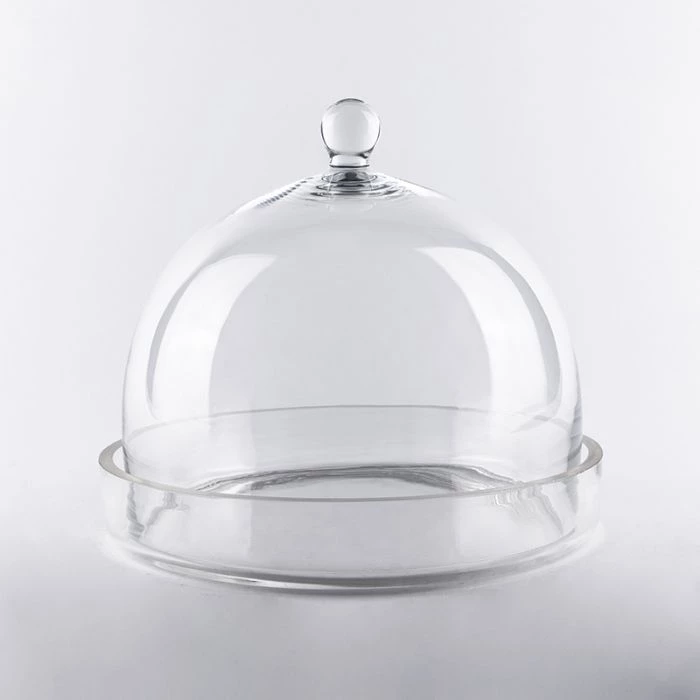 This 8.5-inch tall half-dome design bell cloche jar includes a rounded bell lid paired with a leveled tray. Its uses include incubating delicate seedlings or vegetation, showcasing decadent desserts, or displaying various oddities. If used as a plant terrarium, note the dimensions of this particular design to ensure that your plant can fit. Intricate items are frequently captured inside these cloche jars for whimsical nursery garden designs.