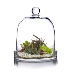 This 11 inches tall round elongated bell cloche jar includes a glass cloche lid paired with a leveled tray. Its uses include incubating delicate seedlings or vegetation, showcasing decadent desserts, or displaying various oddities. If used as a plant terrarium, note the dimensions of this particular design to ensure that your plant can fit. Intricate items are frequently captured inside these cloche jars for whimsical nursery garden designs.