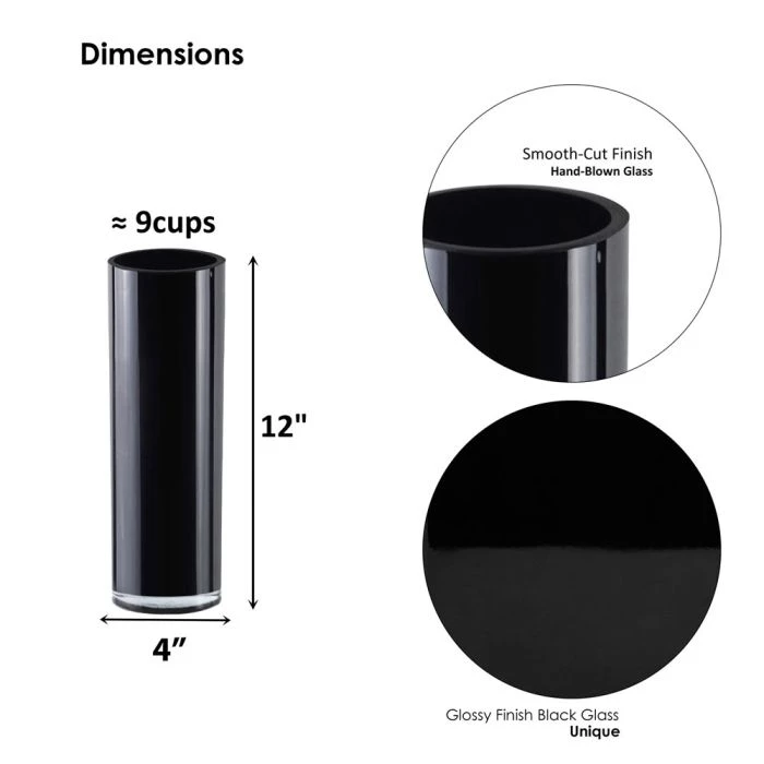 Our black glass cylinder vases are 100% hand-blown, and hand-made. The top rim is cut to perfection, instead of having the cheap-looking machine-made glass cylinder vase with the sealed rim on top. The cylinder vases feature good glass wall thickness to ensure durability. Black color represents elegance and luxury, and so do our beautiful thick and heavy black cylinder vases. It creates a huge contrast between the vase and the colorful flowers, and it sure makes the color of your flowers pop.