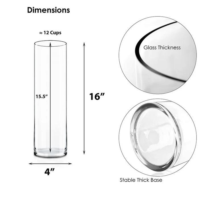 The 4 inches diameter cylinder vases are one of our best sellers. It is an extremely popular vase for the fresh floral arrangement as well as silk floral design. Due to its perfect size, many event planners and designers use our 4 inches cylinder vases for floating candles. It fits the 3” or 3.5” floating candles perfectly. Garden centers and nurseries use these vases for lucky bamboo, succulents, tulips, and roses arrangements. It works great for dried arrangements such as glass flat marbles, stones, and pebbles, potpourri, etc.