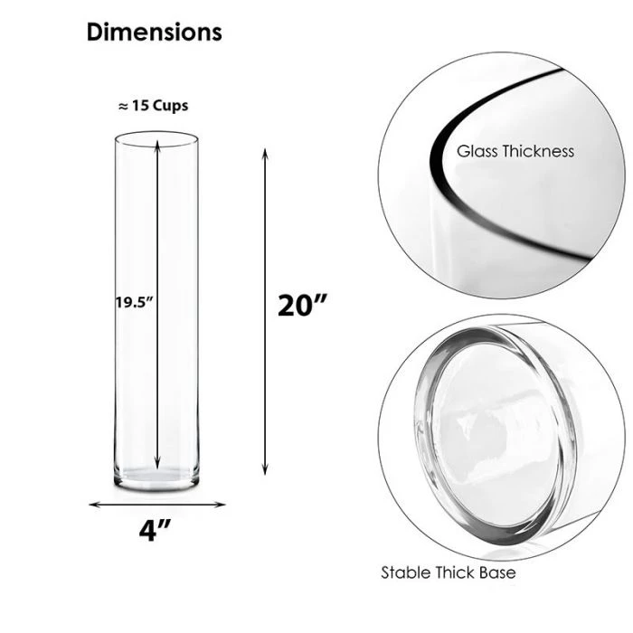 The 4 inches diameter cylinder vases are one of our best sellers. It is an extremely popular vase for the fresh floral arrangement as well as silk floral design. Due to its perfect size, many event planners and designers use our 4 inches cylinder vases for floating candles. It fits the 3” or 3.5” floating candles perfectly. Garden centers and nurseries use these vases for lucky bamboo, succulents, tulips, and roses arrangements. It works great for dried arrangements such as glass flat marbles, stones, and pebbles, potpourri, etc.
