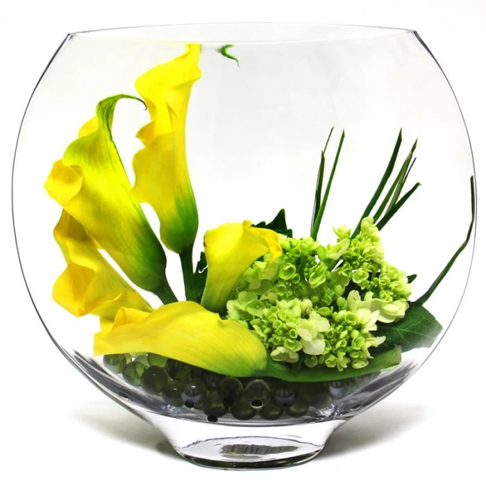 The moon shape vase offers a classic style look which is beautiful and elegant. It paired well with long stem flowers such as green orchids and calla lily.