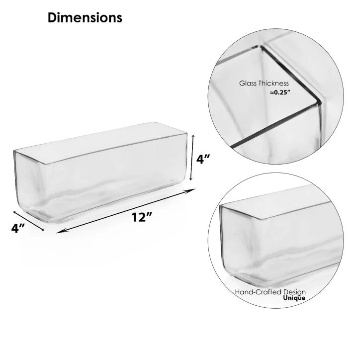 Rectangular is also known as clear long rectangle glass provides a modern accent for the contemporary home and commercial settings. Perfect for presenting short stem floral arrangements, floating displays, candles, lights, or stones as centerpieces at a wedding or room accents.