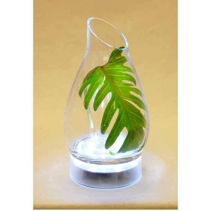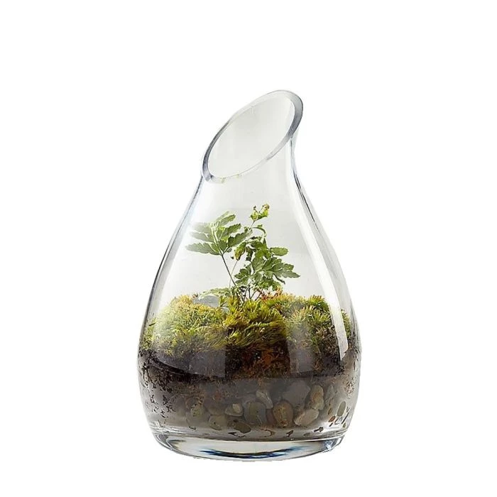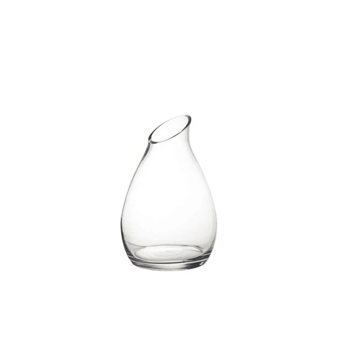 This modern shape glass vase is inspired by carafe vessels. A slant cut flare lip design invites one stem flower or floret for a refreshing splash of color. This accent vase is suitable for multiple locations including breakfast tables at home or as tabletop décor in the office. The angle cut on top of the vase along with the subtle curves of the vase produces a nouveau silhouette for modern living.