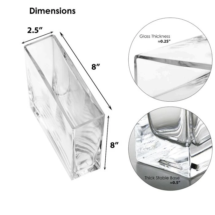 What makes this rectangular vase so unique is the very slim opening. It requires superb craftsmanship to create a piece of this vase. The thickness of the glass is exceptional, it’s so thick and heavy and the quality is way above the average glass in the market. The base of the rectangular vase is almost flat and thick which creates the luxury feel for any home decoration and event.