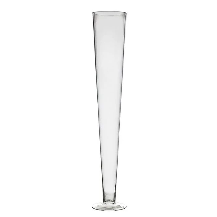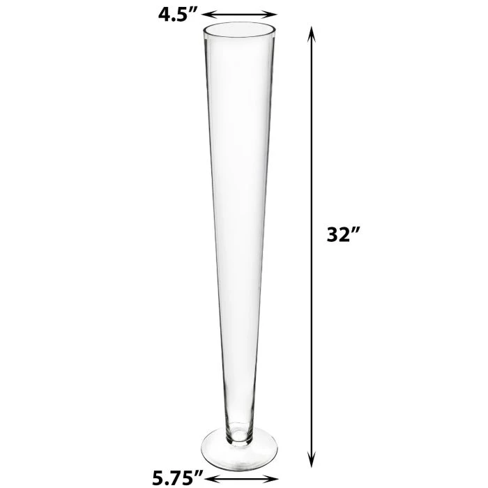 This 32-inch tall clear glass trumpet vase displays a clean straight-sided body sloping gradually to a circular base. This trumpet vase is one of the most popular trumpet vases among wedding designers and DIY brides because its minimal inverted triangular silhouette is modern and endlessly versatile. For brides looking for an all-around functional wedding centerpiece vase, this may be the vase. Many luxuriant hydrangea arrangements, simple long stem flowers, and branches, or dreamy baby’s breath designs have been used with this trumpet vase. The size of this vase is suitable for large to grand scale events that call for modern elegance. One may see this trumpet vase used in upscale hotels and gala events.