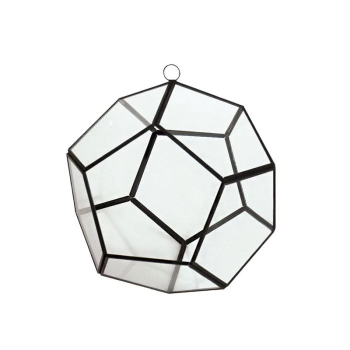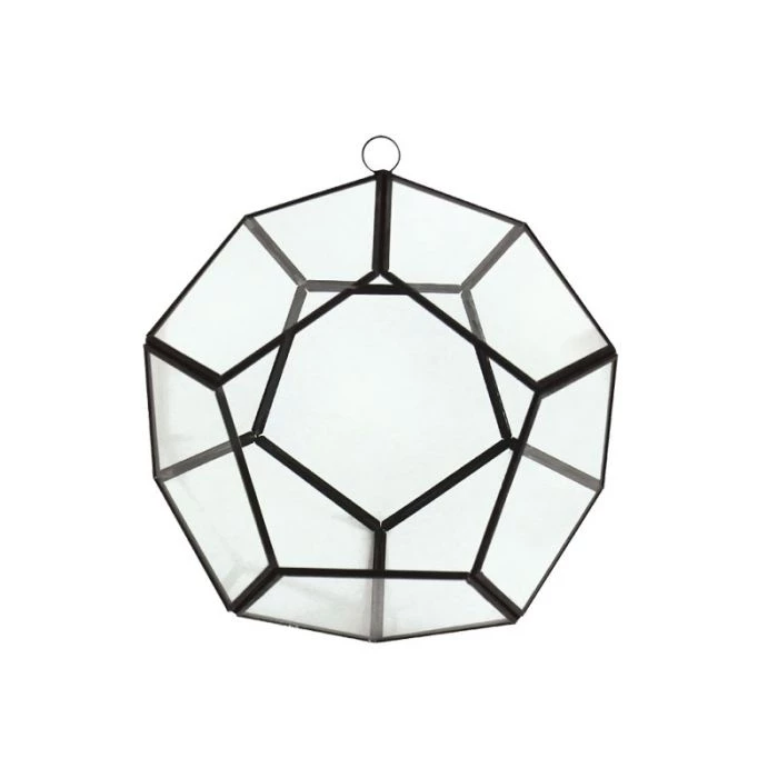 This charming polyhedron shape clear polyhedron is the perfect container for a plant terrarium display. This glass terrarium can be used as a hanging festival decoration as well. The top metal ring can suspend the polyhedron via filament in singles, multiples, or chandelier style.