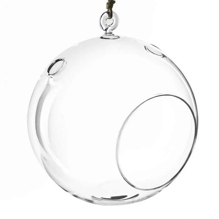 These whimsical spheres of clear hand-blown glass are the perfect container for a plant terrarium display. These glass orbs can be used as hanging tea light candle holders as well. Top glass loop can suspend globe via filament in singles, multiples, or chandelier style. Flat bottom for surface display. Plant, rocks, and other accessories are not included