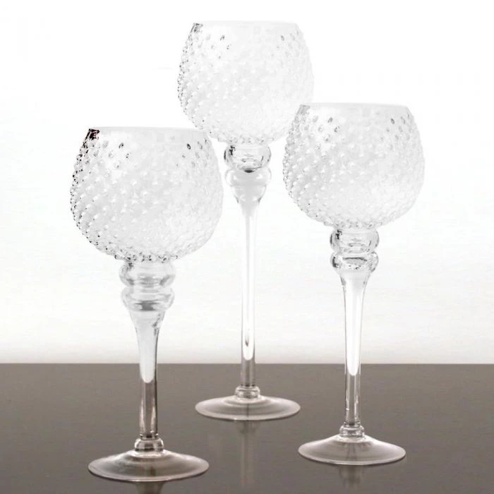 One set of 3 long stems (12, 14, 16 inches tall) candle holders for floating candles. This series of hobnail glass candle holders is tall. The gorgeous hobnail design has its unique classic elegant look. Whether you are planning a wedding, a holiday party, or an anniversary celebration, these darling candle holders will illuminate your event with class. A popular design for these elegant candle holders is to arrange an array of candles in varying heights for a dynamic layout. The open flame from the candle would burn within the glass clear cup.