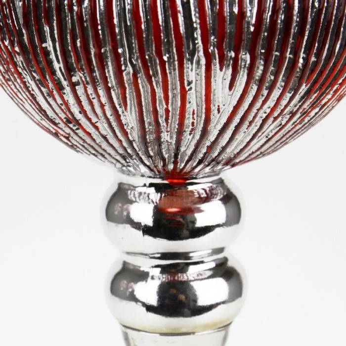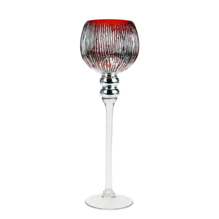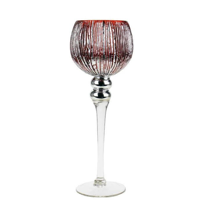 One set of 3 long stem (12, 14, 16 inches tall) candle holders for floating candles. This series of classic red glam wavy etched mercury metallic glass candle holders is tall. The gorgeous etched finished design has its unique classic elegant look. The long stemmed red glass design with numerous clear transparent etched clear stripes allows any candle color to gleam in its surroundings. Whether you are planning a wedding, a holiday party, or an anniversary celebration, these darling candle holders will illuminate your event with class. A popular design for these elegant candle holders is to arrange an array of candles in varying heights for a dynamic layout. The open flame from the candle would burn within the glass red cup.