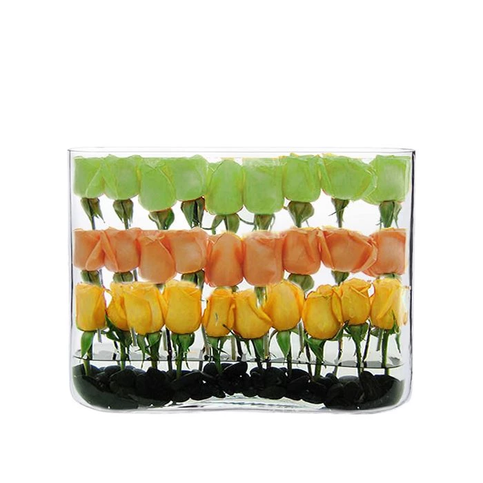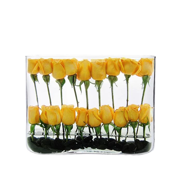These narrower opening glass vases take on a squarish shape from the frontal view but have rounded edges and softened corners. These jumbo vases are ideal as large event centerpieces such as awards ceremony banquets, charity dinners, or corporate functions. In addition, these thick glass vases would make exemplary floral displays on console tables or foyer tables in larger homes. Other designers have used this jumbo vase as a plant terrarium or aquarium for buoyant office decor.