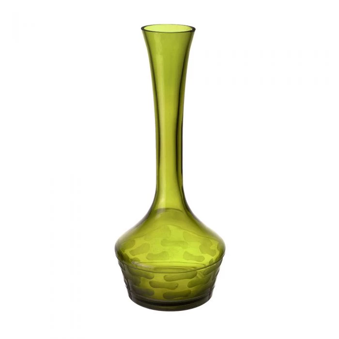 Featuring an olive green color that will make a great addition to your decor. Hard carving facets provide a unique texture. The design may vary slightly due to the handcrafted nature of this vase. This glass vase has an intense color which is then complemented by the simple, yet sophisticated, shapes.